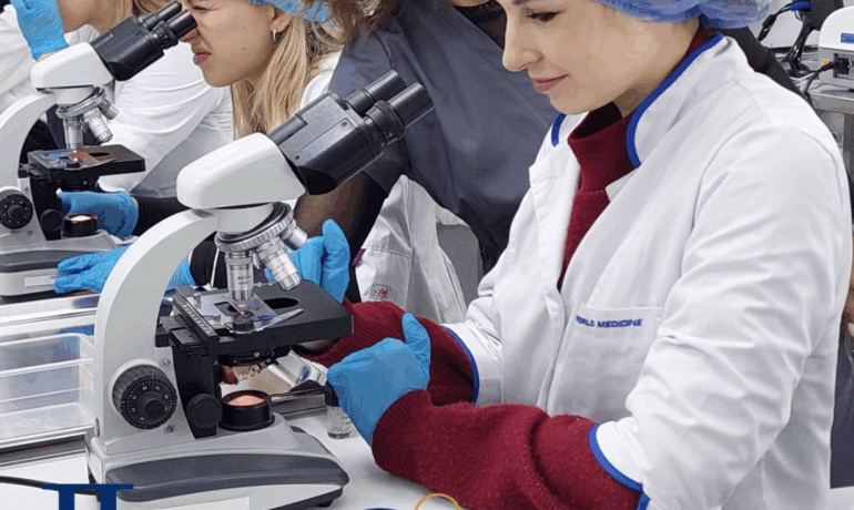Практичні заняття з навчальної дисципліни «Мікробіологія, вірусологія та імунологія» у студентів-стоматологів другого року навчання проводяться на базі лабораторії біомедичних досліджень «KarazinBioMed». Під час занять студенти мають можливість зануритися в атмосферу лабораторних мікробіологічних досліджень, опрацювати практичні навички роботи з мікробіологічним матеріалом, провести мікроскопію та інші дослідження з використанням сучасного обладнання лабораторії.