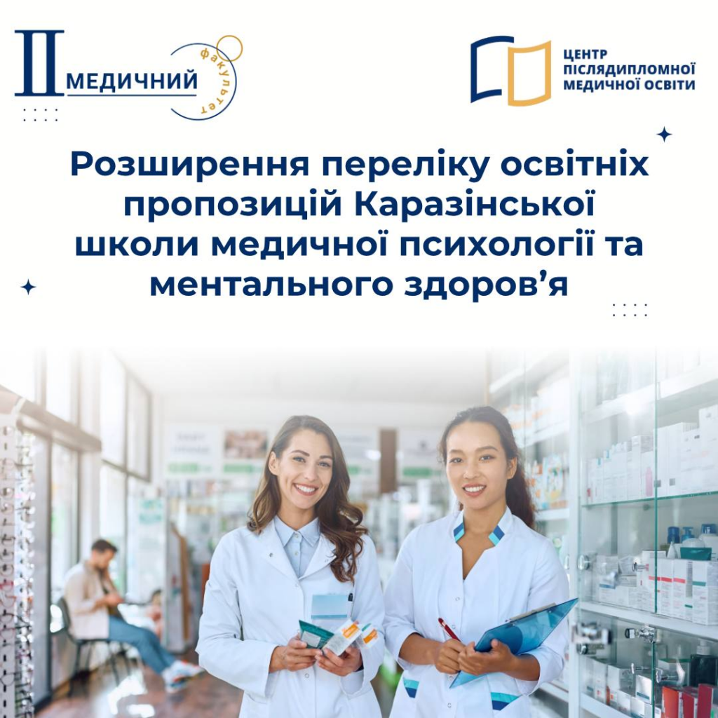 Центр післядипломної медичної освіти ІІ медичного факультету Харківського національного університету імені В. Н. Каразіна та Каразінська школа медичної психології та ментального здоров’я на чолі з відомим фахівцем, науковцем, практикуючим лікарем-психологом, завідувачем кафедри медичної психології, д. мед. н., проф. Майєю САВІНОЮ анонсують розширення переліку напрямків освітньої діяльності у сфері післядипломної медичної освіти.