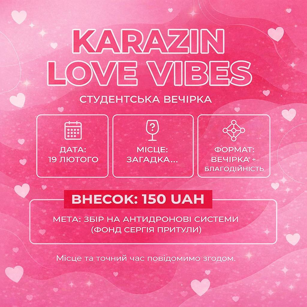 Хочеш відчути справжній ритм свята та відсвяткувати День закоханих у колі Каразінської родини? Приходь «KARAZIN LOVE VIBES»! Ця вечірка – це ідеальний простір для нових знайомств та повного перезавантаження. Ми збираємо студентів всіх факультетів Каразінського щоб разом створити незабутню атмосферу та підтримати дуже важливу справу!